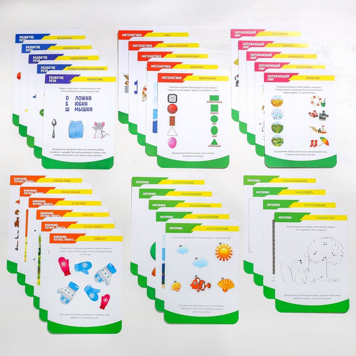 Внутри вы найдёте 30 больших двухсторонних карточек — на каждой из них находится игра или занятие, посвящённые одной из 6 тем: