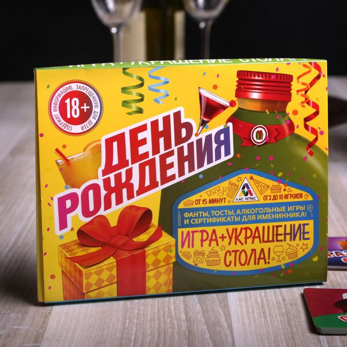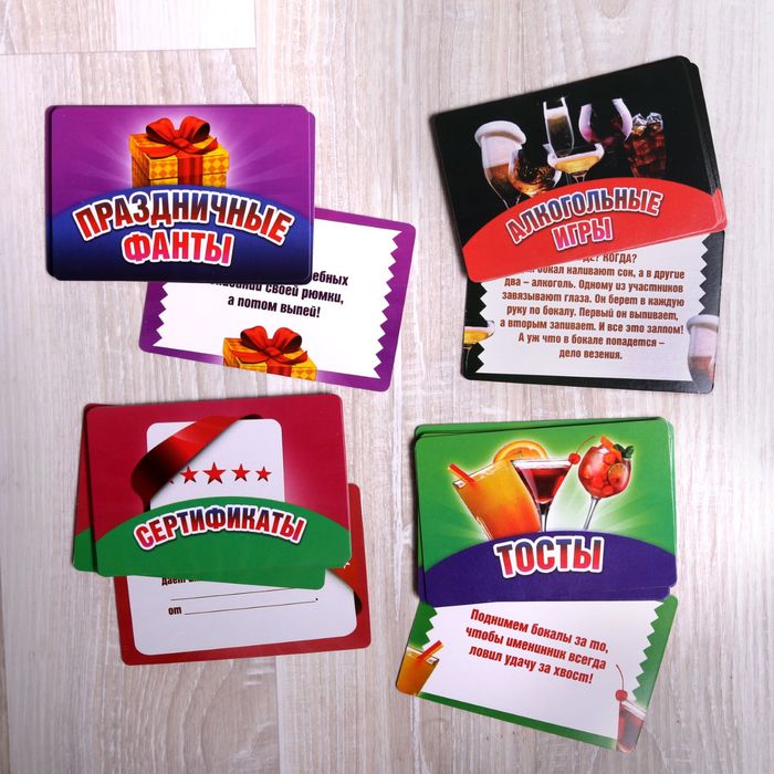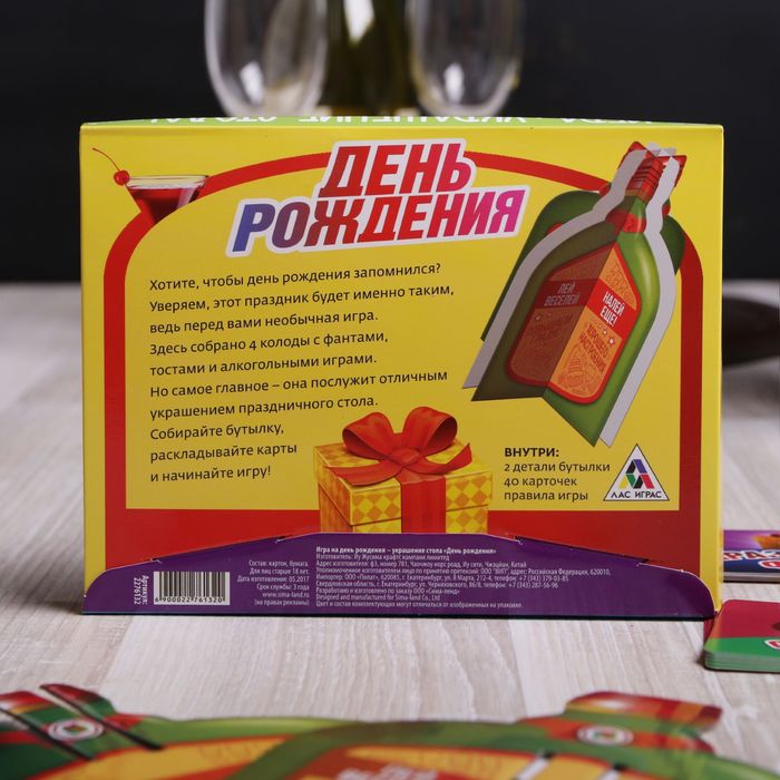 Хотите, чтобы день рождения запомнился надолго? Уверяем вас, праздник будет отличным, ведь перед вами необычный набор. Здесь есть целых 4 колоды с различными фантами, тостами и алкогольными играми. Но самое главное — комплект послужит отличным украшением праздничного стола. Собирайте бутылку, раскладывайте карточки и начинайте игру!