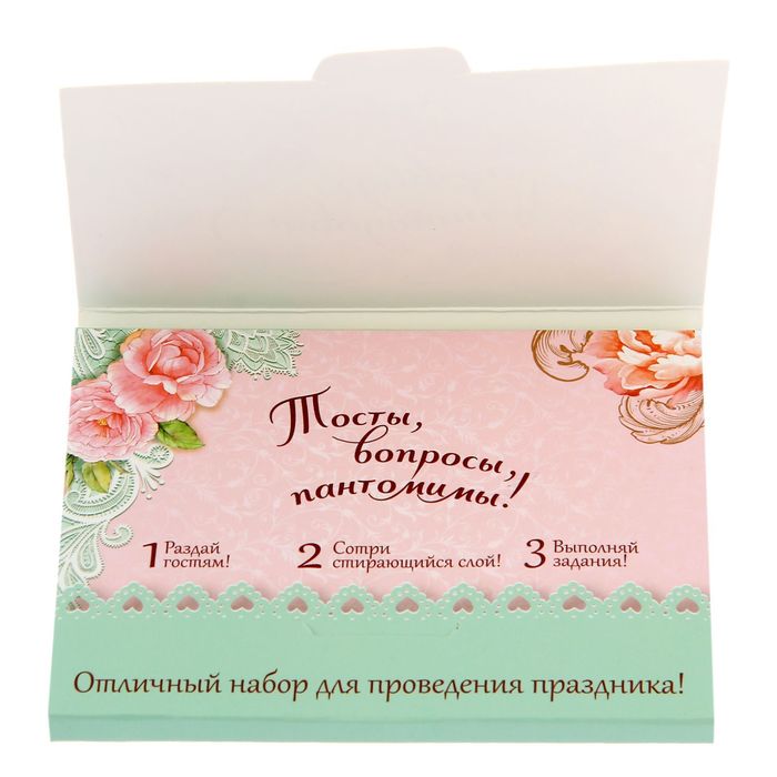 Внутри вы найдёте карточки со скретч-слоем. Раздайте их гостям праздника и начинайте поднимать бокалы! Под защитой скрываются самые разные задания. Выполняйте их по порядку и веселитесь от души!