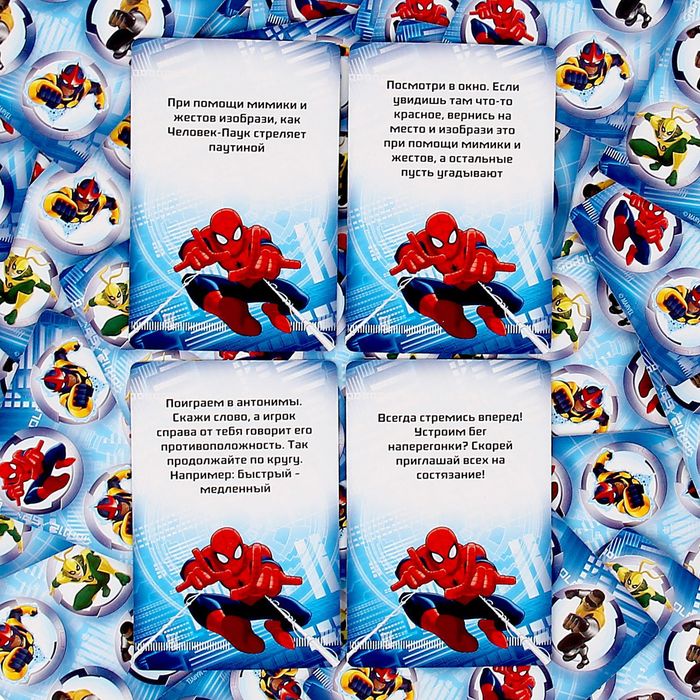 Правила очень просты! Раздайте участникам по 6 карточек, а остальные положите в центр стола. По очереди бросайте 4 кубика с изображением любимых героев и попробуйте раньше всех выложить на стол карточку, на которой будут все выпавшие персонажи. Но не забудьте перечислить их всех! Не справились — Человек-паук приготовил весёлые задания на обратной стороне карточек. А кто первым скинет свои карты, тот и победит!