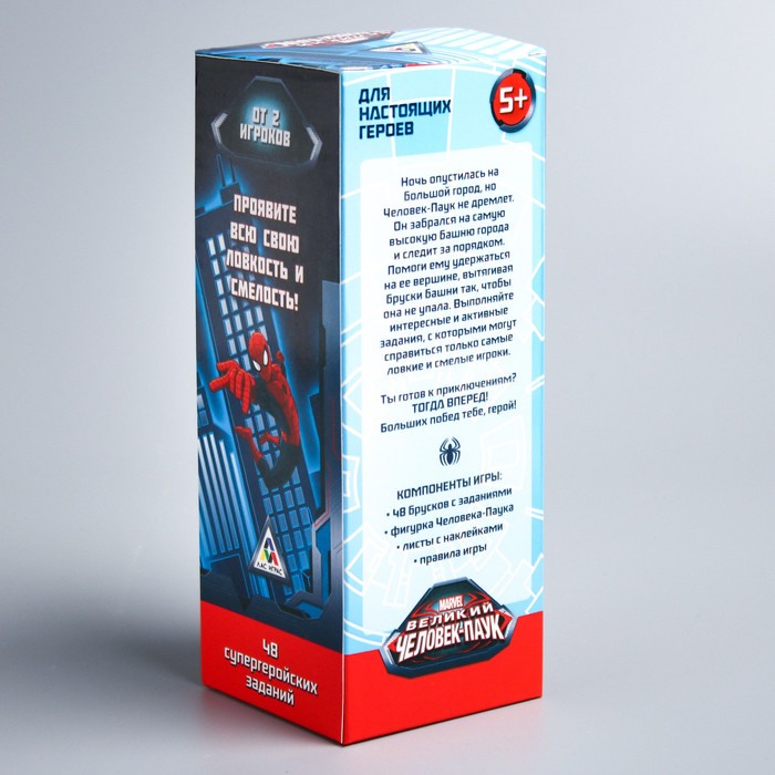 Постройте башню из брусков, уложив их друг на друга по три штуки. На самый верх поставьте Человека-паука. Он будет зорко наблюдать за игрой, а ваша задача — не уронить его. На брусках вы найдёте специальные задания: предстоит изображать слова с помощи мимики и жестов, отвечать на вопросы о супергерое и выполнять весёлые и активные поручения.