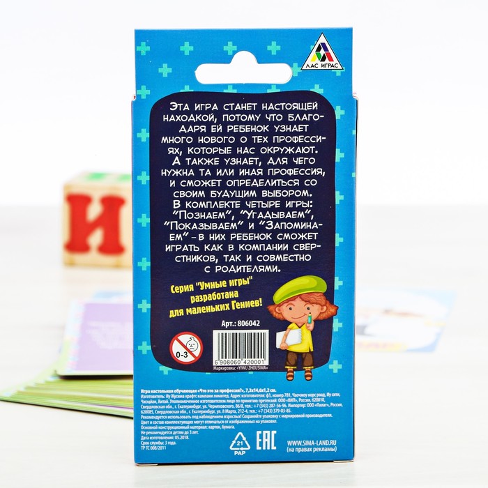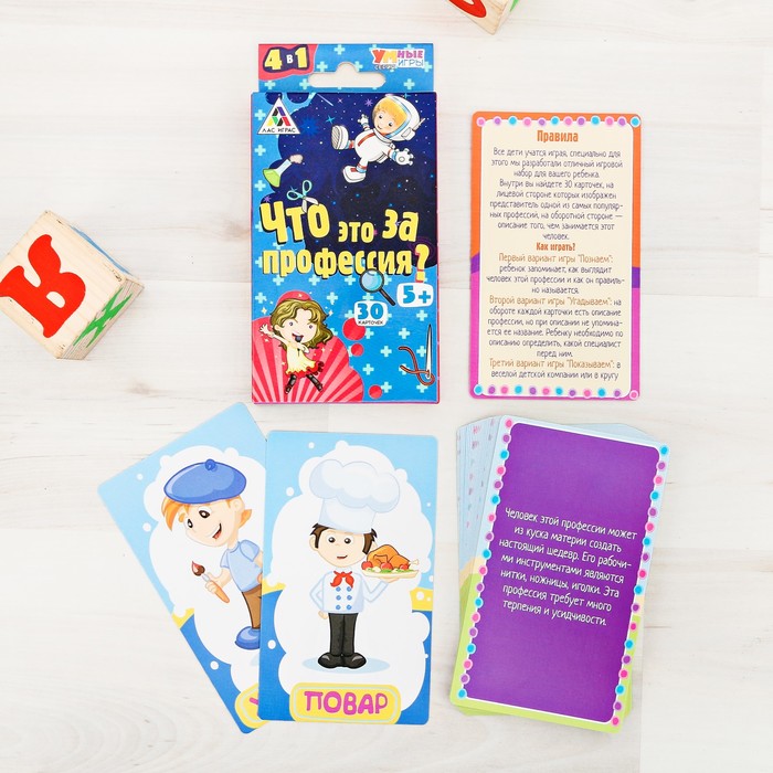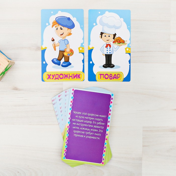 В комплекте вы найдете 30 карточек с самыми разными специальностями. С одной стороны карты изображен представитель одной из самых популярных профессий, а с другой – описание того, чем занимается этот человек. Изучив и запомнив всех специалистов, пусть ваш малыш попробует отгадать по описанию, какой профессии этот человек?