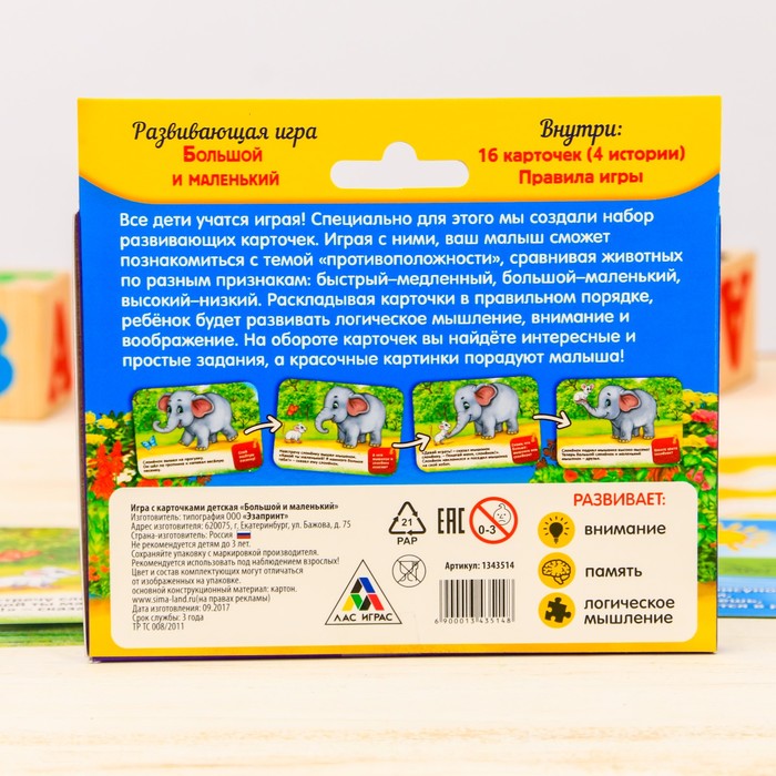 В наборе вы найдёте 4 истории в картинках о животных. Раскладывая карточки в правильном порядке, ребёнок разовьёт логическое мышление, внимание и воображение.