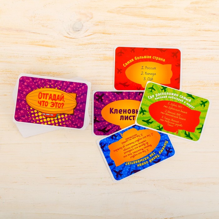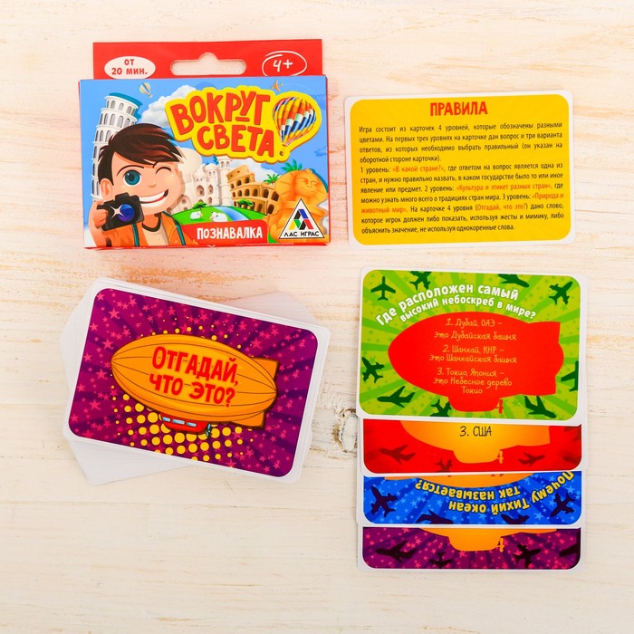 В коробке вы найдете карточки четырех уровней: «В какой стране?», «Культура и этикет разных стран», «Природа и животный мир» и «Отгадай, что это?». В каждой из них есть вопрос, соответствующий теме, и варианты ответов. А в карточке последнего уровня вам нужно будет не отгадать, а объяснить слово, используя только мимику и жесты. Играйте за себя или объединяйтесь в команды, импровизируйте!