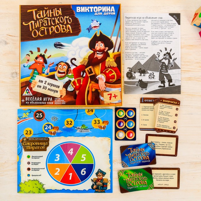 Также в коробке вы найдёте карточки с загадками. А «Пиратские задания» позволят вам устроить настоящие соревнования в силе и ловкости!