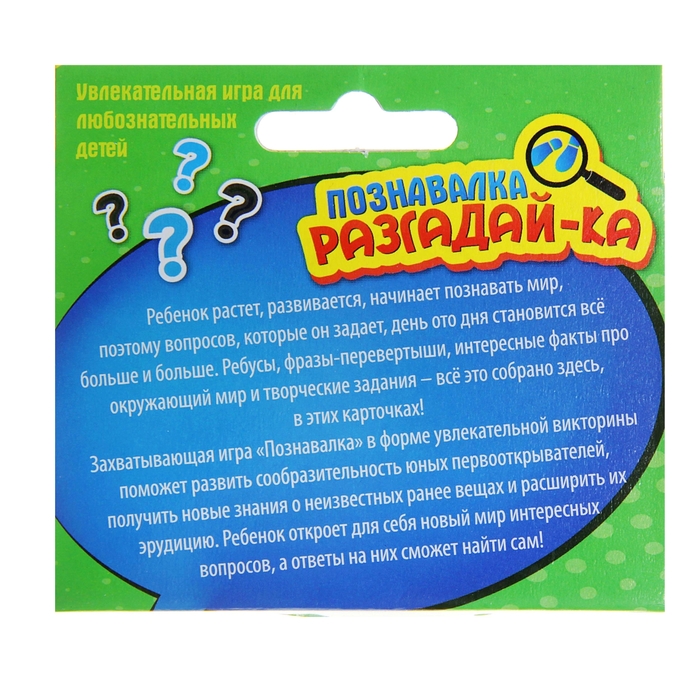 У вас растет юный почемучка, который интересуется окружающим миром? Вокруг столько всего интересного: ребусы, фразы-перевертыши и удивительная природа! А вопросов день ото дня становится всё больше и больше… Игра «Познавалка «Разгадай-ка» в форме увлекательной викторины поможет расширить кругозор и эрудицию вашего ребенка!