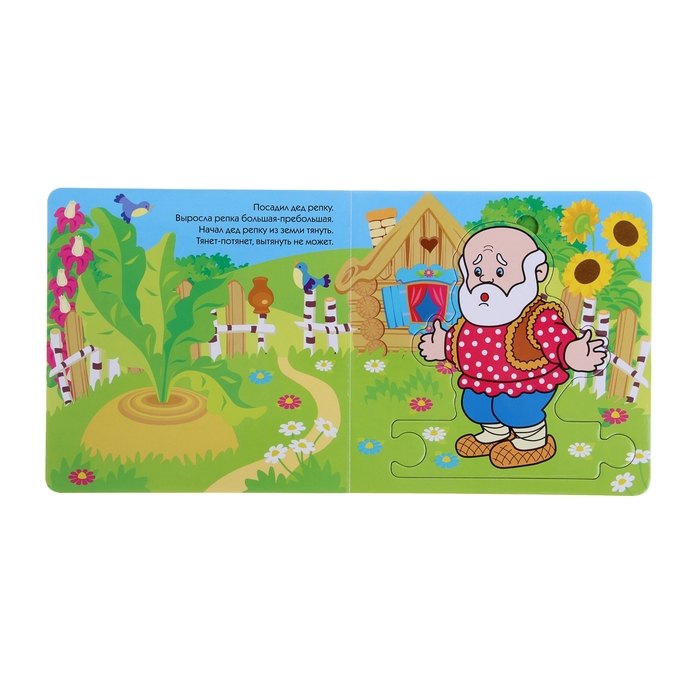 В этой книжке вы найдёте семь картинок-пазлов с изображением героев любимой сказки «Репка».