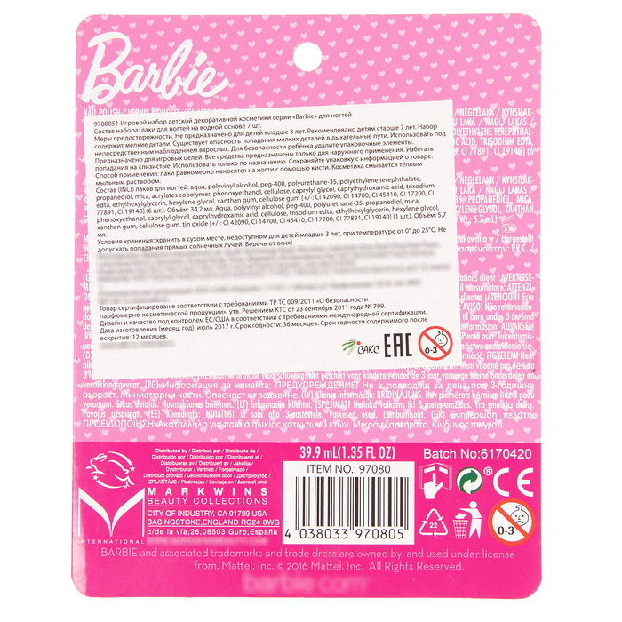 Может быть, именно такой необычный товар, как Игровой набор для ногтей Barbie, раскроет неожиданные способности у вашего ребёнка. И даже если он не станет новым Рафаэлем, то ему, определённо, обеспечена богатая фантазия, креативное мышление и золотые руки.
