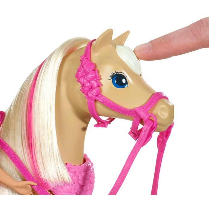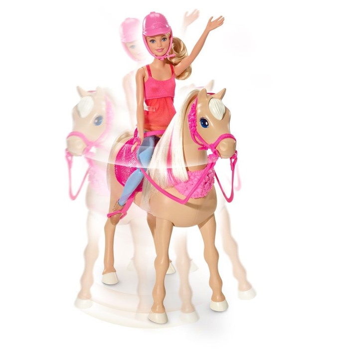 Barbie и её любимая питомица готовы повторить сцену из мультфильма «Барби и её сёстры в погоне за щенками»! Чтобы лошадка начала танцевать, нажмите на кнопку в виде чёлки. Куколка тоже может присоединиться к танцу: сидя верхом или стоя рядом с партнёршей на специальных подставках. Для безопасности наездницы предусмотрены шлем, поводья и стремена.
