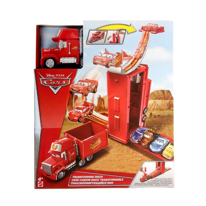 Игрушечный тягач Мак-Трак выглядит совсем как оригинал из мультфильма «Тачки». Его задний борт откидывается и становится трапом для маленьких машинок. Кепка героя оборудована кнопкой, которая активирует пусковой механизм.