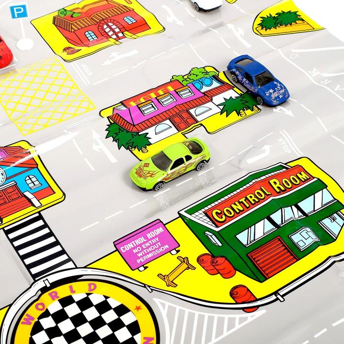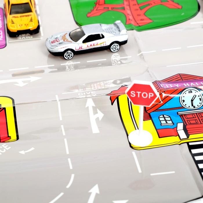 Игровой набор в чемодане: 9 металлических машинок, знаки, размер коврика 70х80
