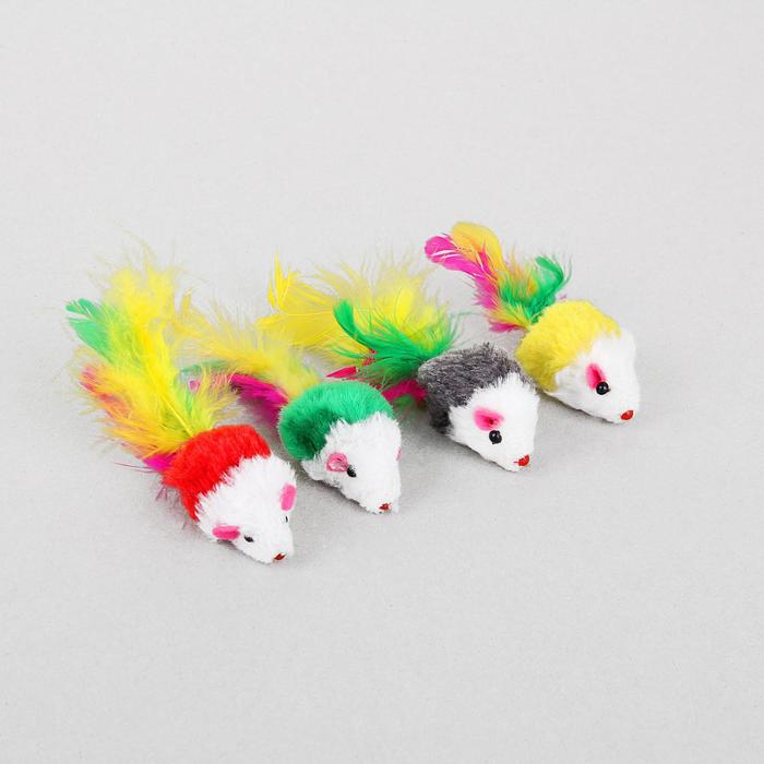 Игрушка для кошек "Малая мышь" с перьями, микс цветов