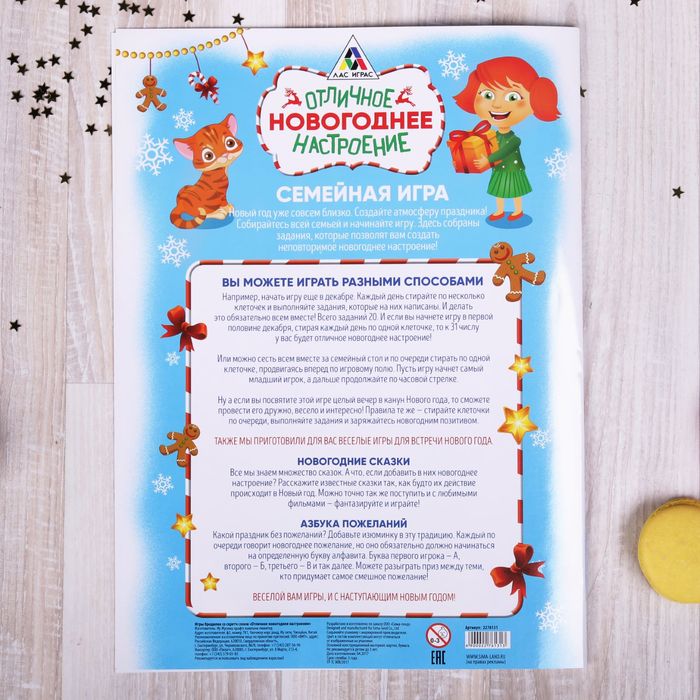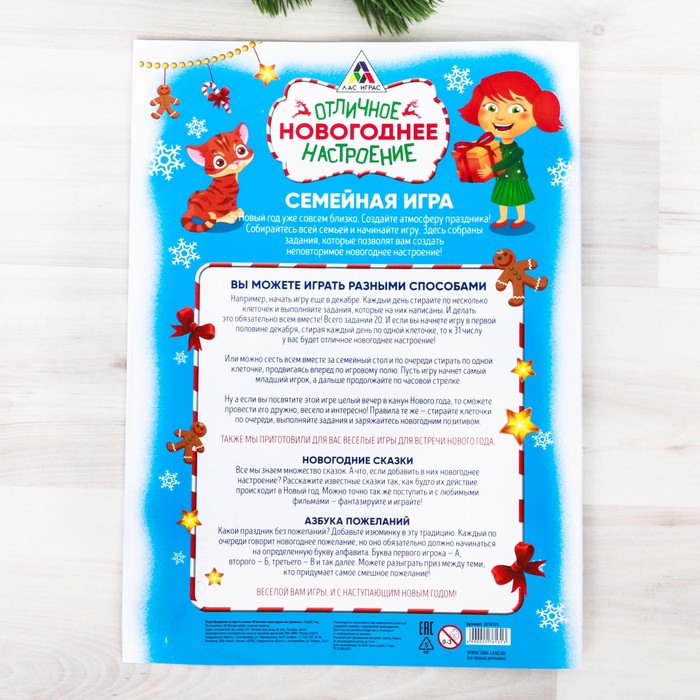 Вы можете начать игру ещё в декабре — каждый день стирайте по несколько клеточек и выполняйте задания. Или сядьте за семейный стол и посвятите этому развлечению целый вечер в канун Нового года! Также здесь вы найдёте ещё 2 игры. В одной из них вы будете сочинять новогоднюю сказку, а в другой — говорить пожелания на все буквы алфавита.
