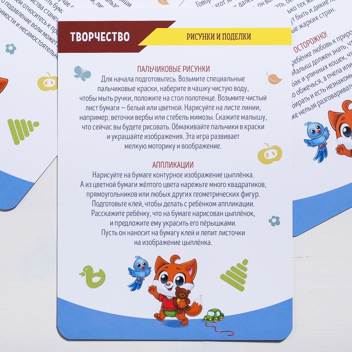 Внутри вы найдёте 20 больших двухсторонних карточек — на каждой из них находится игра или занятие, посвящённые одной из 8 тем: