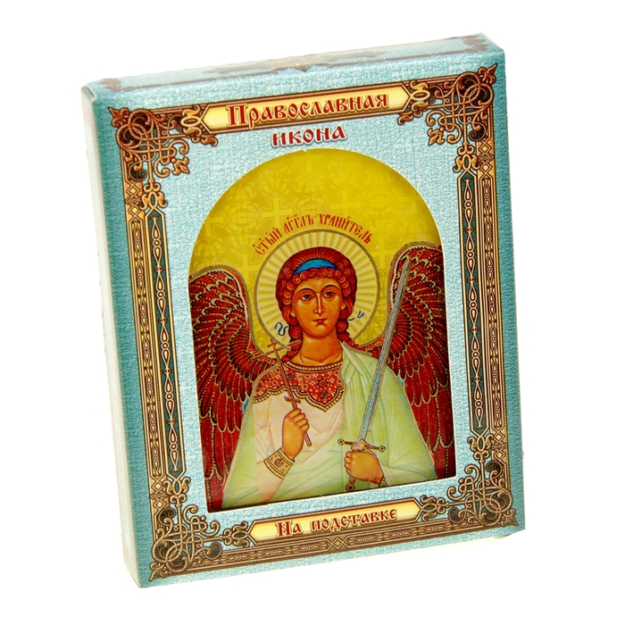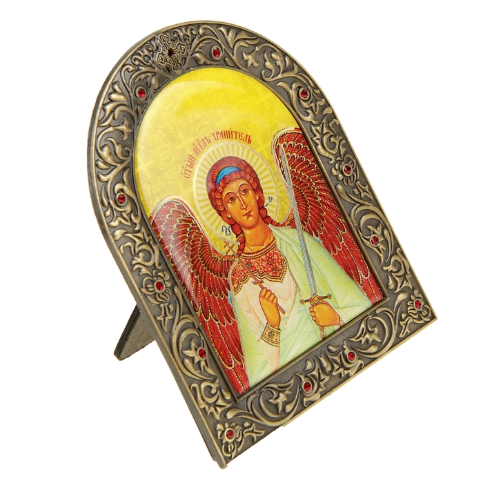 Икона "Ангел-Хранитель" на подставке выполнена из качественного сплава бронзового цвета с цветистым орнаментом в котором вставлены стразы. Посередине вклеено изображение с тиснением под смоляным слоем. На обратной стороне имеется качественная картонная подставка черного цвета, такую икону удобно ставить на стол. Выглядит по-настоящему богато и достойно. Икона полностью соответствует канонам Православной Церкви. Упакована в оригинальную коробку.