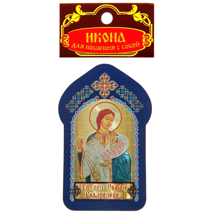Икона для ношения с собой "Святой преподобный Роман Сладкопевец" изготовлена из фольгированного пластика в форме купола, такую миниатюрную икону удобно носить с собой: она не мнется, не промокает, не теряет цвет. На обратной стороне иконки слова "Спаси и сохрани".
