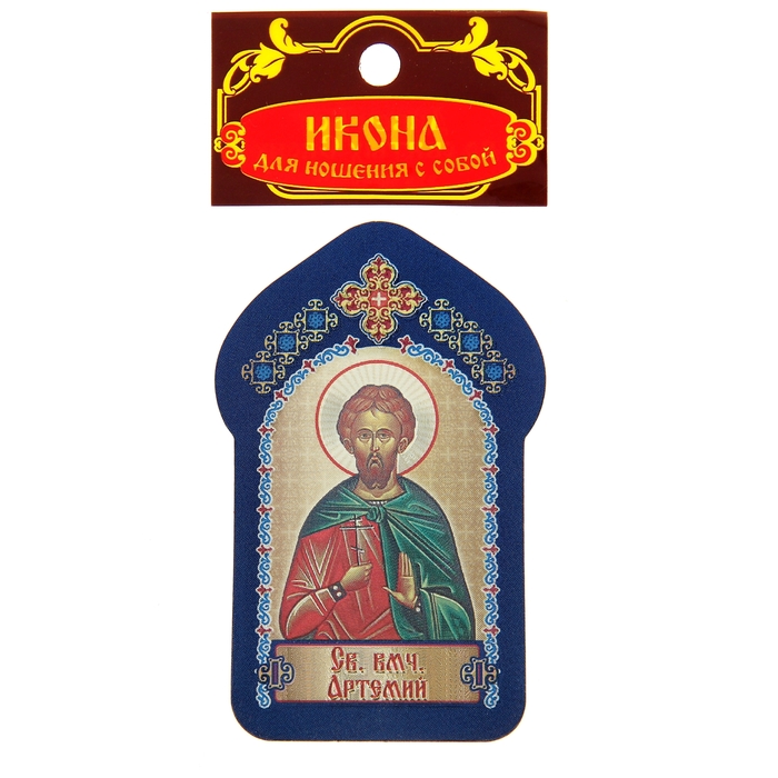Икона для ношения с собой "Святой великомученик Артемий" изготовлена из фольгированного пластика в форме купола, такую миниатюрную икону удобно носить с собой: она не мнется, не промокает, не теряет цвет. На обратной стороне иконки слова "Спаси и сохрани".