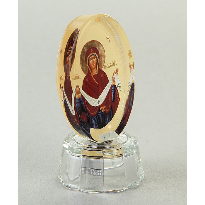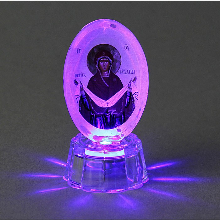 Икона "Покров Пресвятой Богородицы" со светодиодом, овальная выполнена из чистого, высококачественного стекла. Изображенный образ полностью соответствует канонам православной церкви. Она также имеет светодиод, который будет долго светиться разными цветами. Если батарейки иссякнут, их всегда можно заменить.