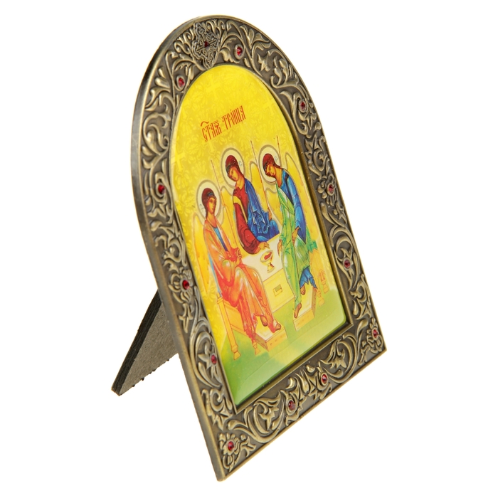 Икона "Святая Троица" на подставке выполнена из качественного сплава бронзового цвета с цветистым орнаментом в котором вставлены стразы. Посередине вклеено изображение с тиснением под смоляным слоем. На обратной стороне имеется качественная картонная подставка черного цвета, такую икону удобно ставить на стол. Выглядит по-настоящему богато и достойно. Икона полностью соответствует канонам Православной Церкви. Упакована в оригинальную коробку.