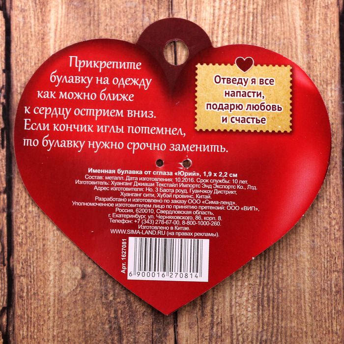 Именная булавка от сглаза "Юрий" — сувенир в полном смысле этого слова. И главная его задача — хранить воспоминание о месте, где вы побывали, или о том человеке, который подарил данный предмет. Преподнесите эту вещь своему другу, и она станет достойным украшением его дома.