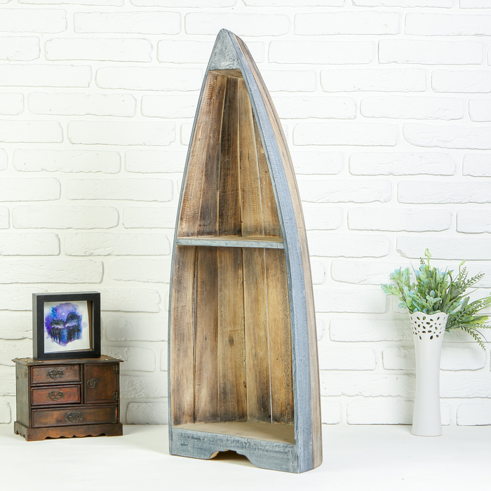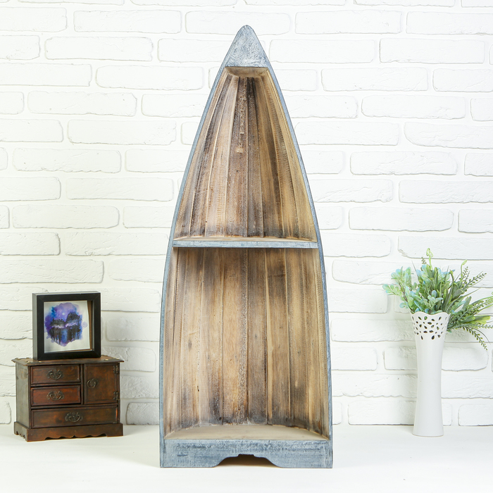 Интерьерный сувенир "Лодка с 2-мя полками" 100х38х23 см, серо-голубая, дерево