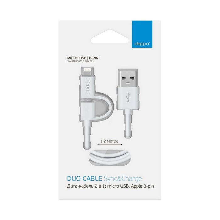 Кабель Deppa (72203) 2 в 1: Apple 8-pin micro USB, белый, 1,2 м — это аксессуар, который увеличивает функциональность компьютера или другого прибора, подключая интерфейсы смежных устройств.