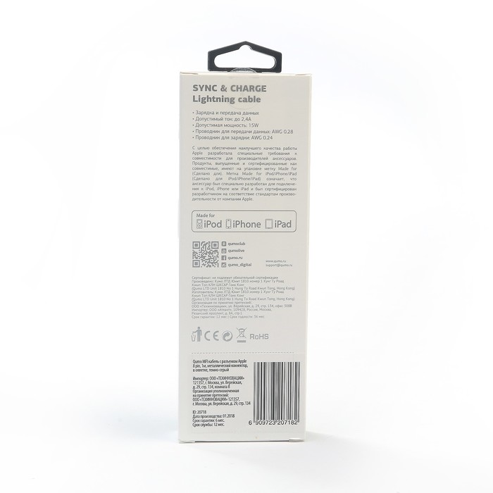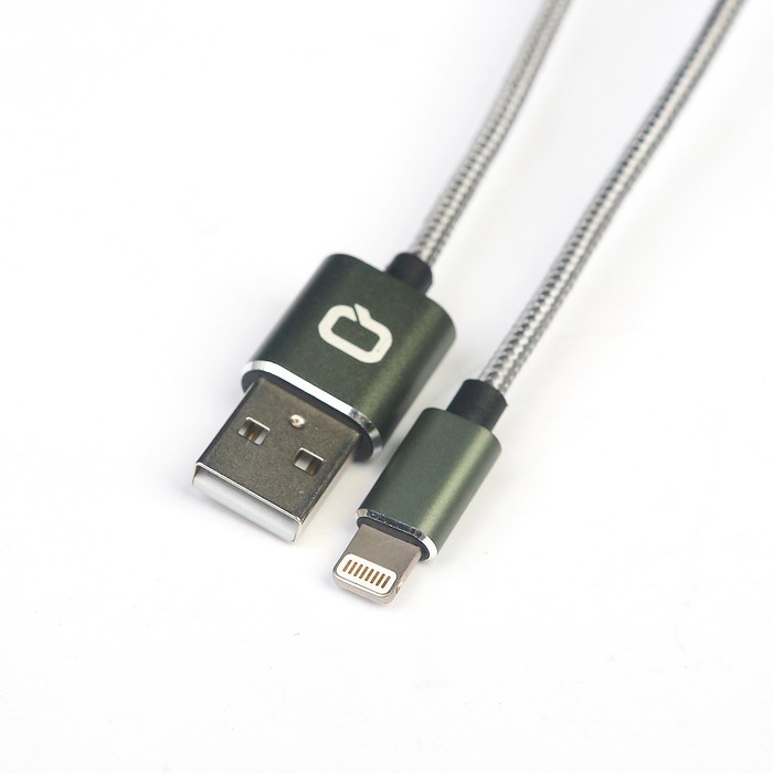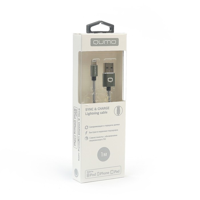 Кабель Qumo, для зарядки и передачи данных, Apple iPhone, 8 pin, 1 м, в оплетке, темно-серый