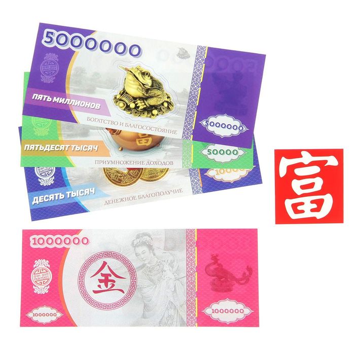 Согласно фэншуй, цвет обладает своими свойствами и энергией. Финансовые потоки притягивают 4 определённых цвета. В наборе вы найдёте купюры этих цветов. Перед их использованием проведите обряд активации, который подробно изложен в инструкции. Также в наборе вы найдёте карточку с иероглифом, передайте ей свою энергию, наполнив контуры иероглифа цветом, и карта станет вашим личным магнитом богатства.