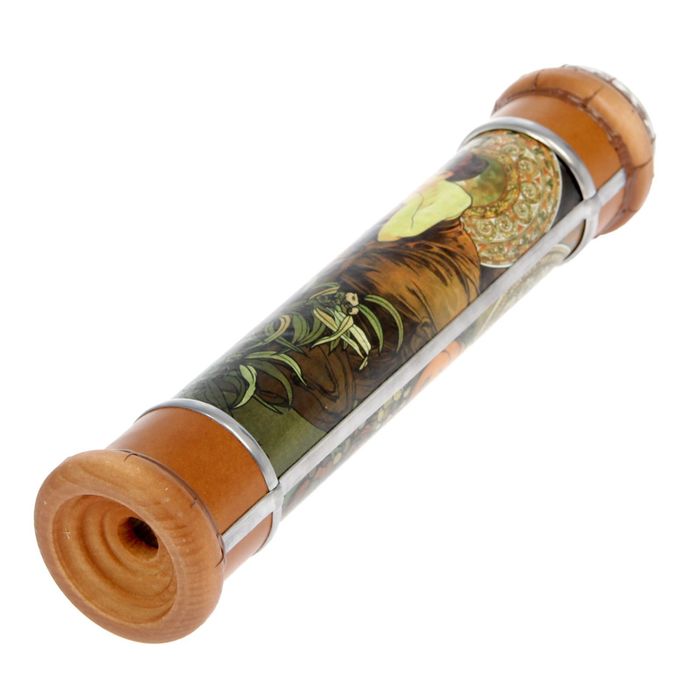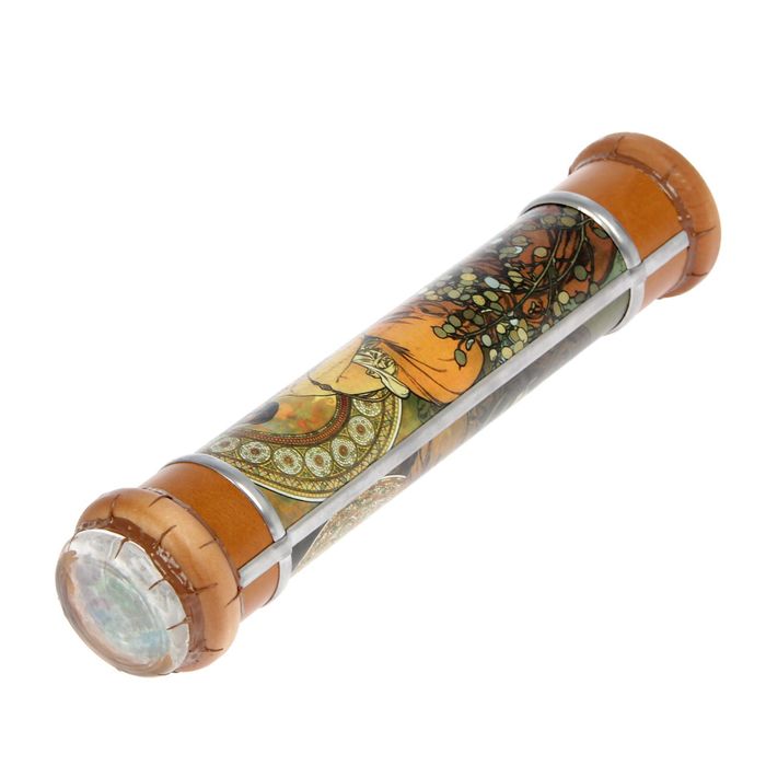 Данный калейдоскоп создан по репродукции картины чешского художника Альфонса Мухи. Мастера украсили корпус изделия вручную, а также применили особую систему зеркал с несколькими углами наклона, использовали цветное витражное стекло и оригинальный декор.