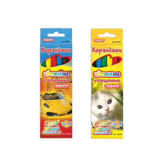 Карандаши ПИФАГОР "Котята, Автомобили", 6 цветов, утолщенный корпус, яркие цвета