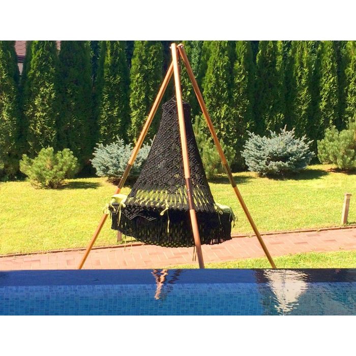 Если на вашей даче нет подходящей опоры (дерево, стальная труба и т. д.) для установки подвесного кресла, тогда вам понадобится специальный каркас. Он поможет надёжно закрепить изделия разных размеров благодаря стальным крючкам. Конструкция устойчива и безопасна. В период летнего сезона можно хранить на улице: не боится проливного дождя и знойного солнца.