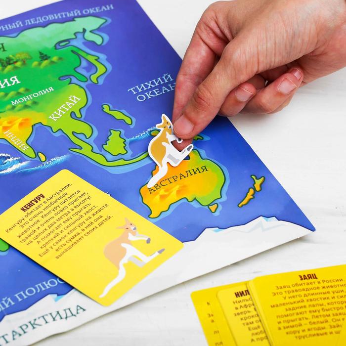 Мир вокруг такой большой… А сколько в нём зверей, рыб и птиц! Они обитают в самых разных уголках нашей планеты. Познакомьте ребёнка с животными. Зачитывайте увлекательные факты с карточек, находите наклейки и располагайте их на большом игровом поле. С помощью этого набора вы узнаете много новой и интересной информации.
