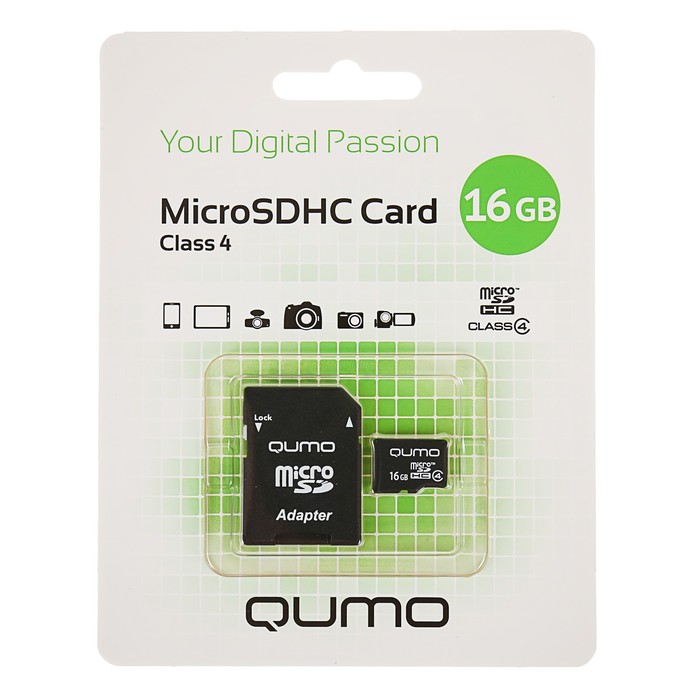 Карта памяти microSDHC Qumo 16 Гб class 4, с адаптером используется в качестве сменного носителя для фото-, видеокамер, видеорегистраторов, игровых консолей и прочих цифровых гаджетов, требовательных к скорости сохранения данных.