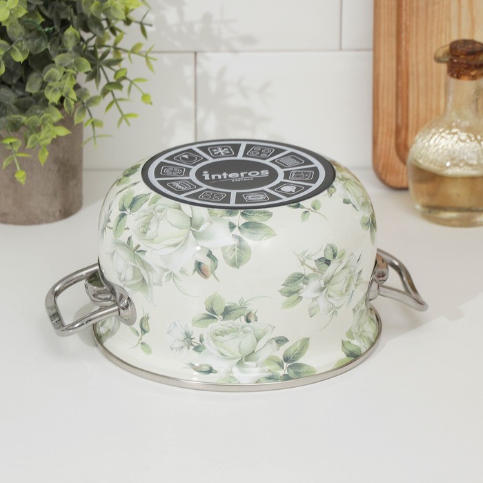 Эмалированная кастрюля Interos из качественной стали, покрытой двухслойной стеклокерамической эмалью, отлично подходит для приготовления и хранения различных блюд.