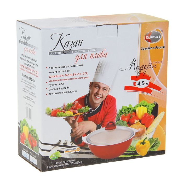 Казан для плова 4,5 л "Модерн" с крышкой из литого алюминия отличается замечательными противопригарными свойствами. Эргономичная ручка выполнена из термопластика и позволяет готовить без риска получения ожога.
