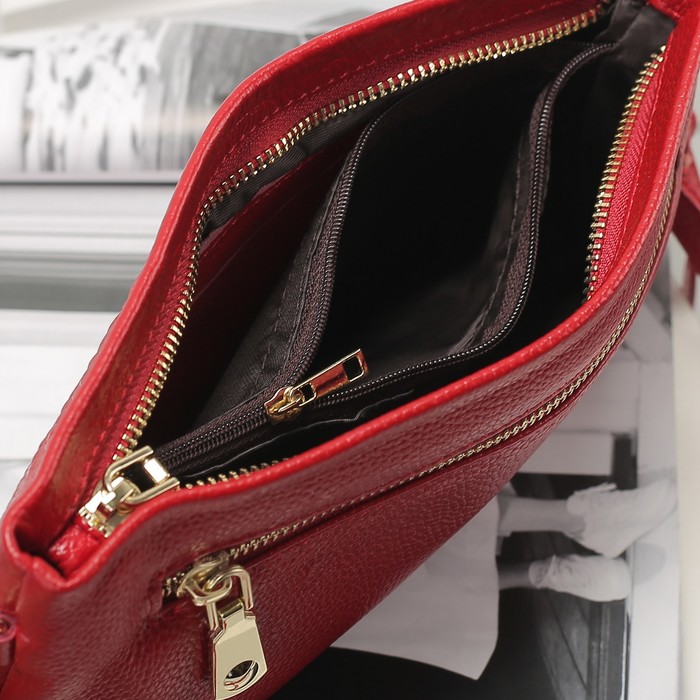 Клатч женский, 1 отдел с перегородкой, наружный карман, ручка, длинный ремень, цвет красный