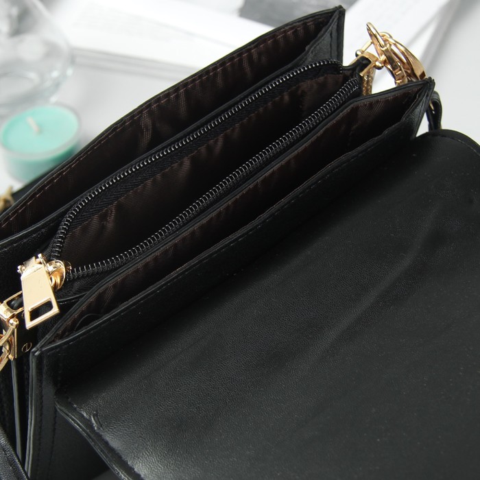 Клатч женский, 3 отдела на молнии, с ручкой, регулируемый ремень, цвет чёрный