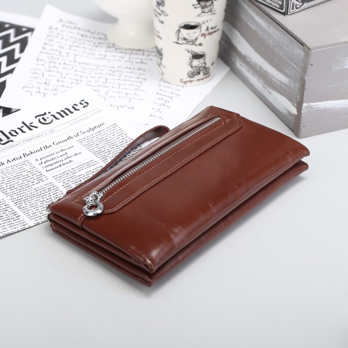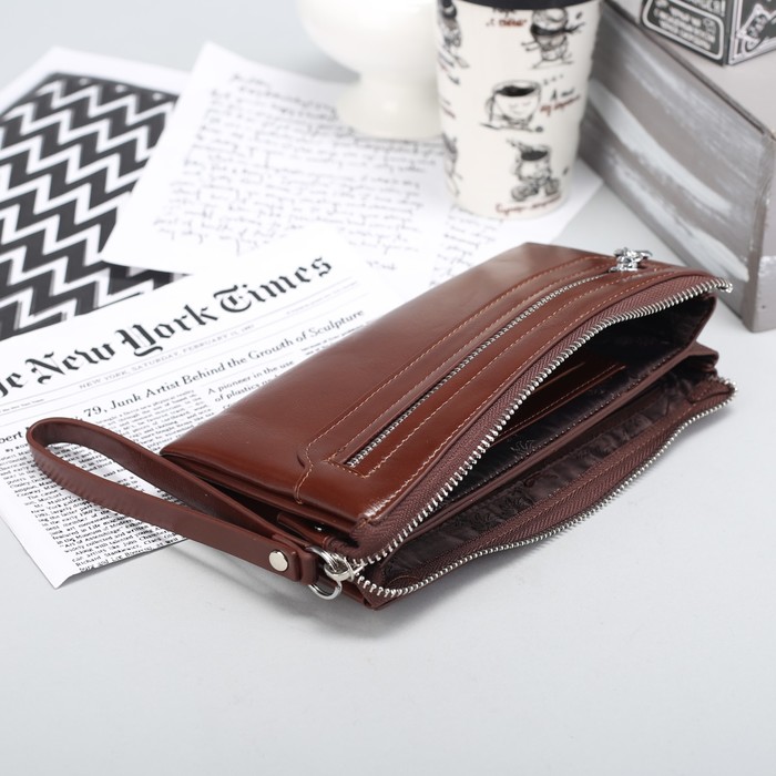 Клатч женский на молнии, 3 отдела, наружный карман, с ручкой, цвет коричневый