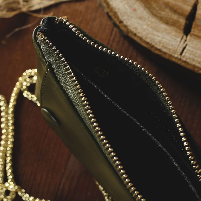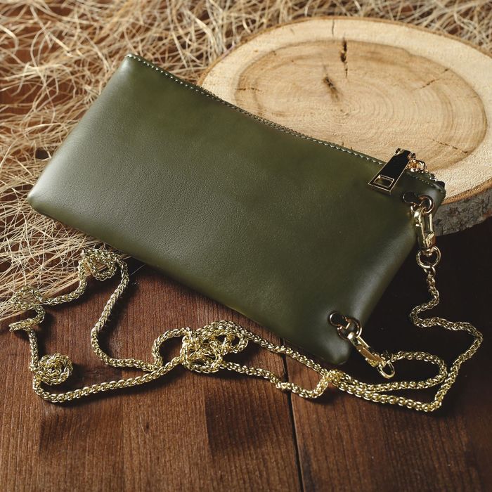 Клатч женский, отдел, для карт, наружный карман для телефона, длинная цепь, цвет зелёный