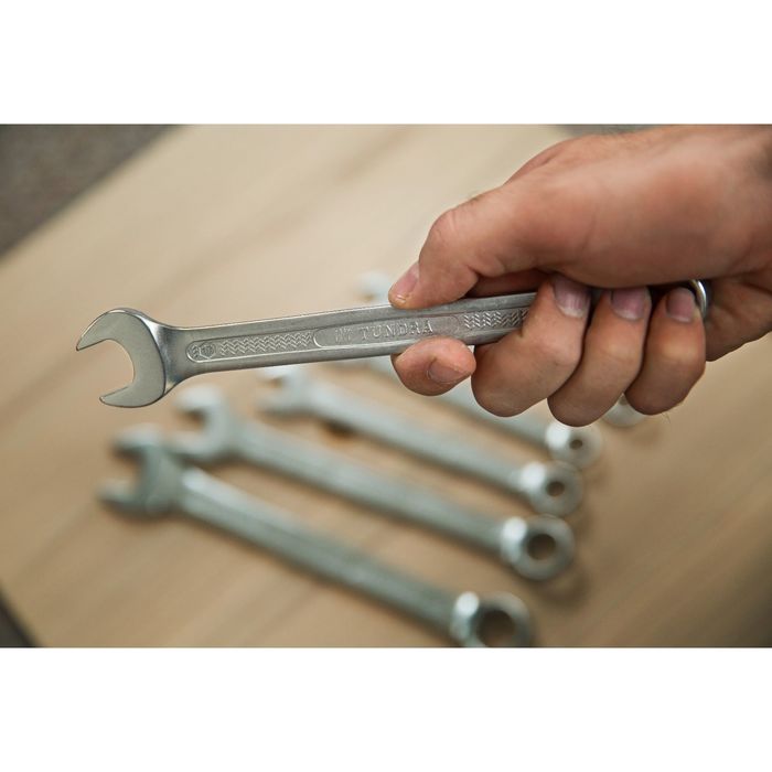 Ключ TUNDRA представляет собой сочетание накидного и рожкового ключа. Открытый зев предназначен для монтажа и демонтажа резьбовых соединений с шестигранным профилем. Кольцевой зев имеет 12 рабочих граней, что делает его эффективным при отворачивании тугого крепежа, в том числе в труднодоступных местах. Изготовлен из хромованадиевой стали, отличается высокой твёрдостью, механической прочностью и хорошей коррозийной стойкостью.