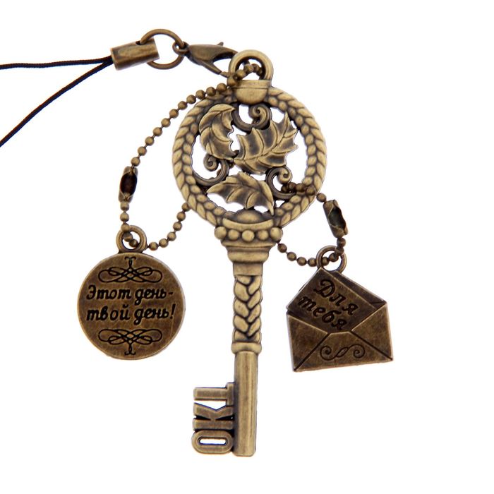 На ключике указан день и месяц, а на стержне красуется надпись «Счастья» и висит брелок с пожеланиями.