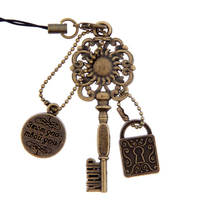 На ключике указан день и месяц, а на стержне красуется надпись «Счастья» и висит брелок с пожеланиями.
