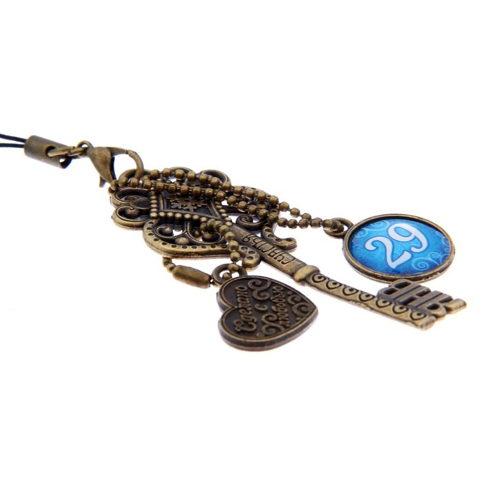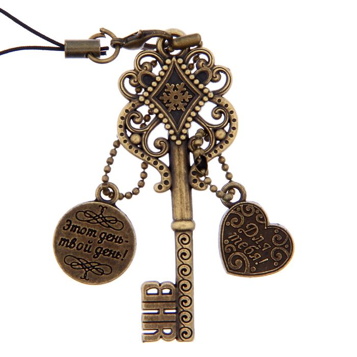 На ключике указан день и месяц, а на стержне красуется надпись «Счастья» и висит брелок с пожеланиями.