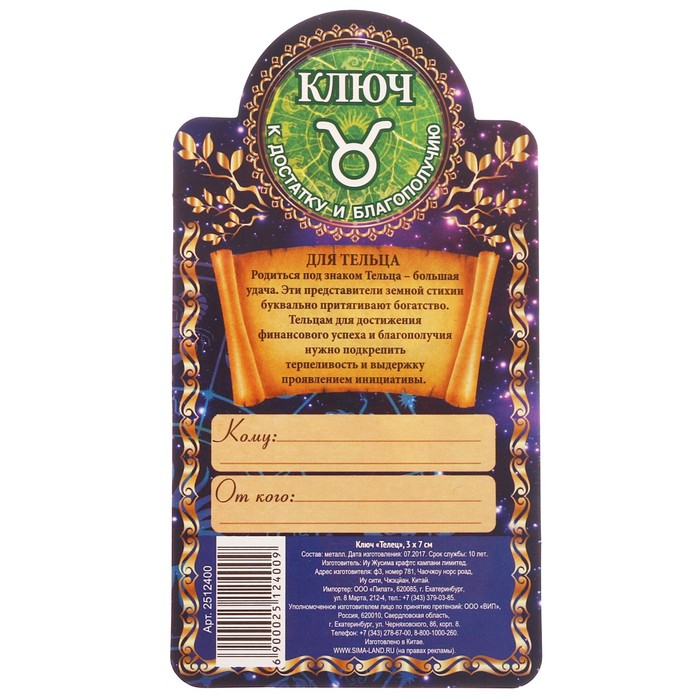 Ключ "Телец", 3 х 7 см — сувенир в полном смысле этого слова. И главная его задача — хранить воспоминание о месте, где вы побывали, или о том человеке, который подарил данный предмет. Преподнесите эту вещь своему другу, и она станет достойным украшением его дома.