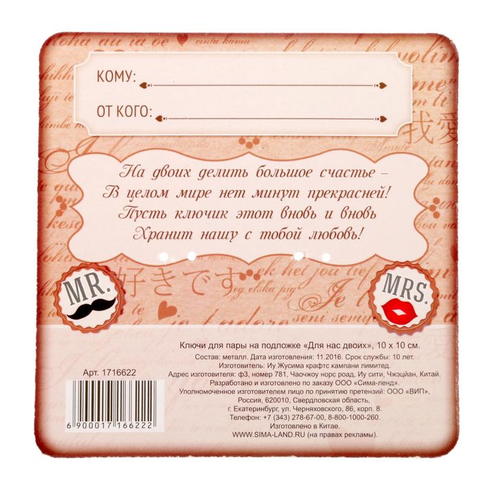 Ключи для пары "Для нас двоих" — сувенир в полном смысле этого слова. И главная его задача — хранить воспоминание о месте, где вы побывали, или о том человеке, который подарил данный предмет. Преподнесите эту вещь своему другу, и она станет достойным украшением его дома.