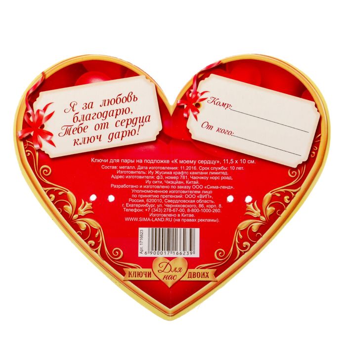 Ключи для пары "К моему сердцу" — сувенир в полном смысле этого слова. И главная его задача — хранить воспоминание о месте, где вы побывали, или о том человеке, который подарил данный предмет. Преподнесите эту вещь своему другу, и она станет достойным украшением его дома.