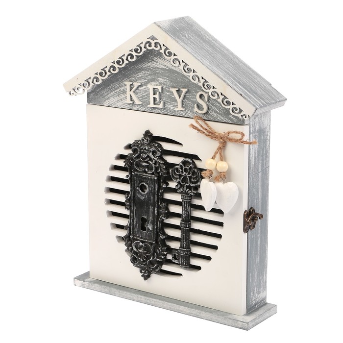 Ключница дерево 6 крючков "Замочная скважина и ажурный ключ" белая с серым 30х22,5х6,5 см