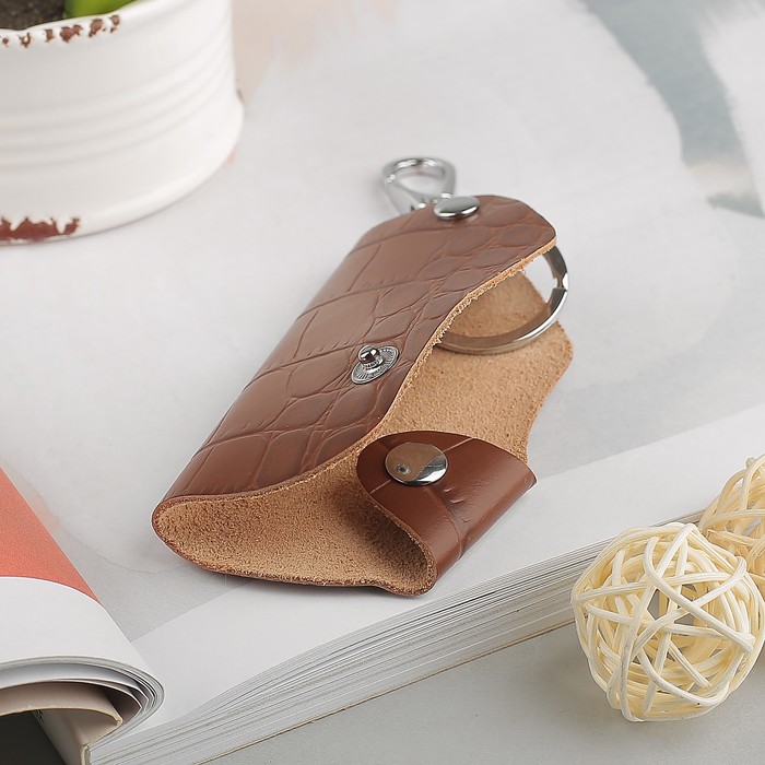 Ключница на кнопке, кольцо внутри, карабин, цвет коричневый