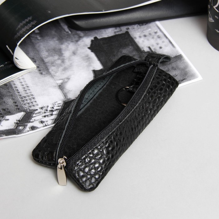Ключница на молнии, 1 отдел, кольцо, кайман, скат, цвет чёрный