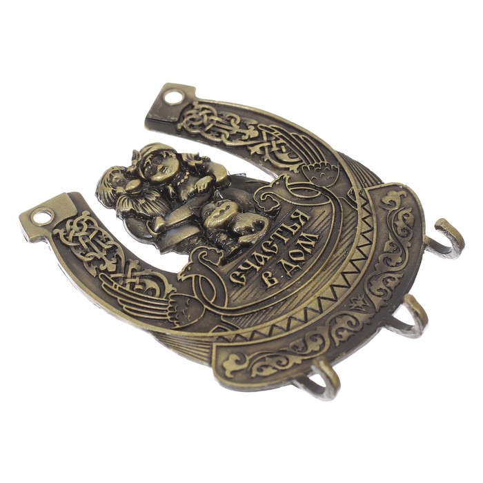 Ключница выполнена в виде подковы в эксклюзивном дизайне. На ней расположился добрый домовой с душевными пожеланиями. Как известно, домовой — действенный талисман для привлечения удачи, вдохновения и позитивной энергии в дом. На ключницу надёжно крепятся металлические крючки, а сама она легко монтируется на стену.
